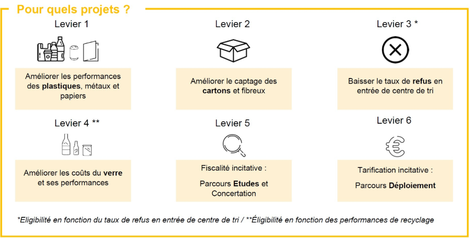 Les collectivités pourront déposer un projet portant sur un ou plusieurs des 6 leviers listés ci-contre.