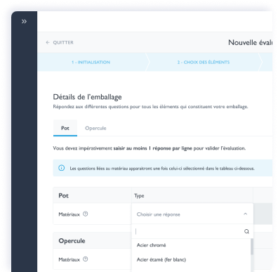 Deux informations sont nécessaires pour définir la famille d’emballage : la forme de l’emballage et son matériau majoritaire (>50% du poids de l’emballage).