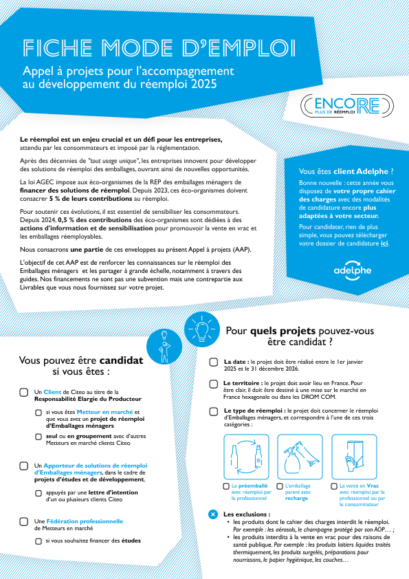 En fonction de votre projet, vous pourrez être financé voire accompagné techniquement par les équipes de Citeo et Adelphe.