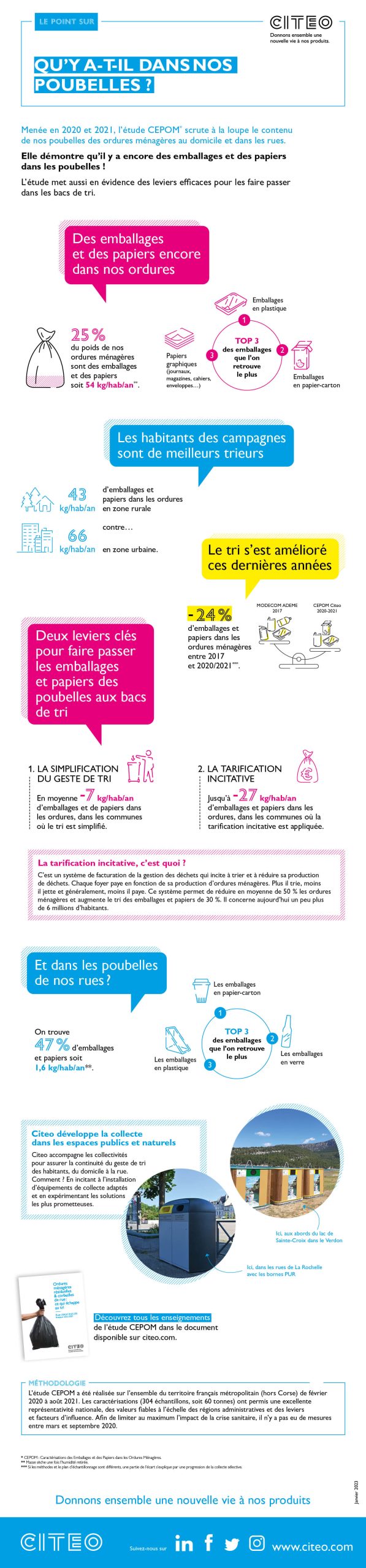 Menée en 2020 et 2021 par Citeo, l'étude CEPOM nous révèle ce que contiennent nos poubelles, au domicile et dans la rue. Devinez quoi ? Une quantité non négligeable d'emballages et de papiers dont la très grande majorité pourrait devenir de nouvelles ressources, grâce à notre geste de tri et au recyclage. Combien ? Lesquels ? Comment les faire passer des poubelles aux bacs de tri ? Notre étude vous dit tout.