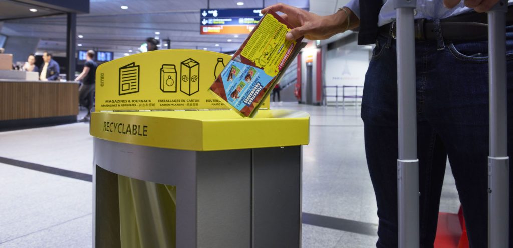 Le projet vise à mettre en place le tri dans l’aéroport à l’aide de corbeilles bi-flux installées sur l’ensemble du parcours passagers : des parcs de stationnement automobiles ou des accès en transports en commun, jusqu’à l’entrée dans l’avion.