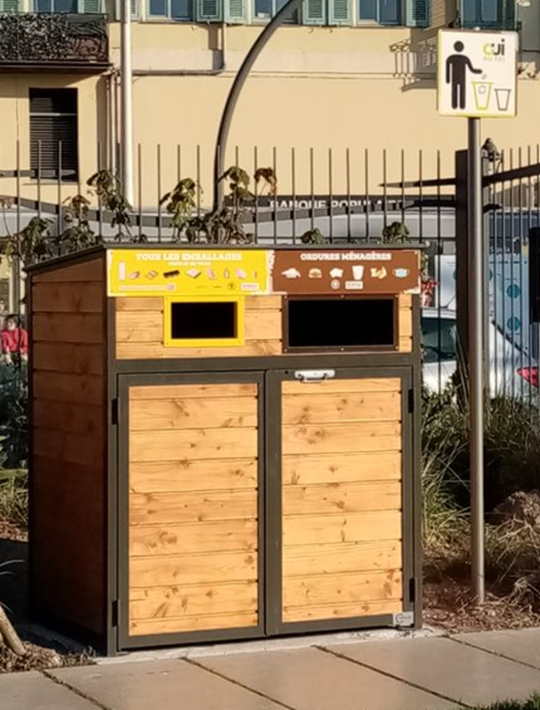 Equipements ? 40 abris-bacs pour les emballages en verre, et 40 corbeilles pour les emballages légers et les ordures ménagères.