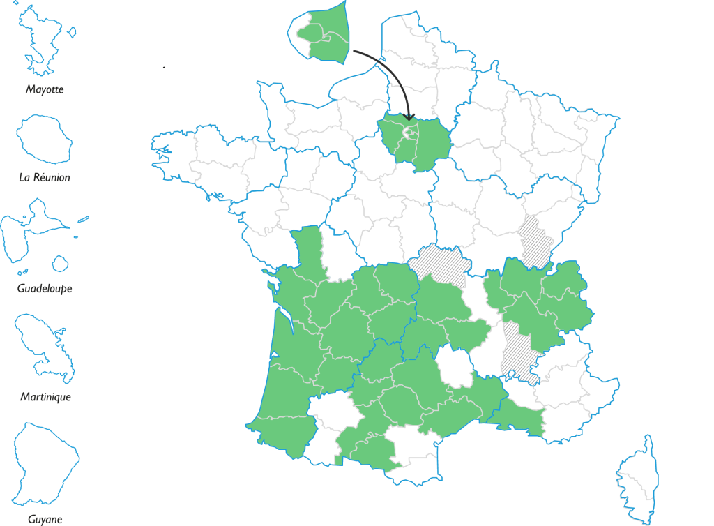 • Île-de-France : Essonne, Paris, Seine-et-Marne, Seine-Saint-Denis, Val-de-Marne, Val-d’Oise, Yvelines