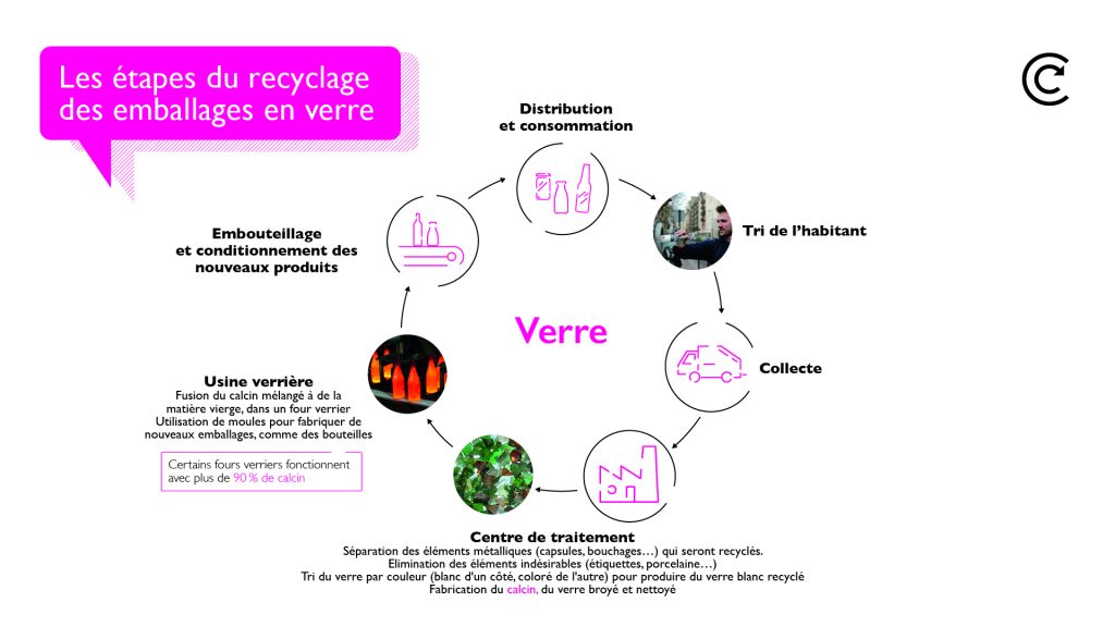 Côté fabrication et recyclage, c’est un réseau de proximité qui s’est créé entre les lieux de consommation, les 14 centres de traitement qui préparent la matière à recycler et les 17 usines verrières qui fabriquent les emballages en verre dont certains fours peuvent fonctionner avec plus de 90% de verre recyclé, le calcin. Proximité ? oui, parce que 260 kilomètres en moyenne séparent les lieux de collecte des usines de production et recyclage.